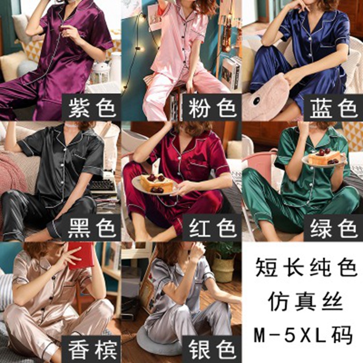 夏のガーデニングのシルクパジャマ女性半袖長ズボンのカーディガンの大きいサイズのM-5XLのシミュレーションの糸の家の服の10色のスーツ