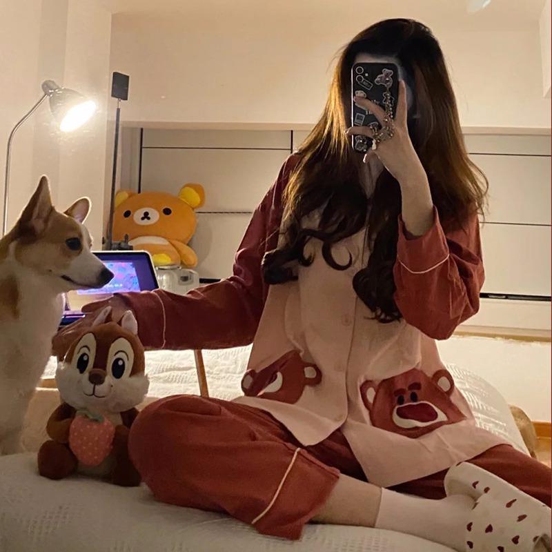 韓国版ins甘いパジャマ女性長袖ゆるいいちご熊少女ホームウェア生放送外国貿易外着スーツ