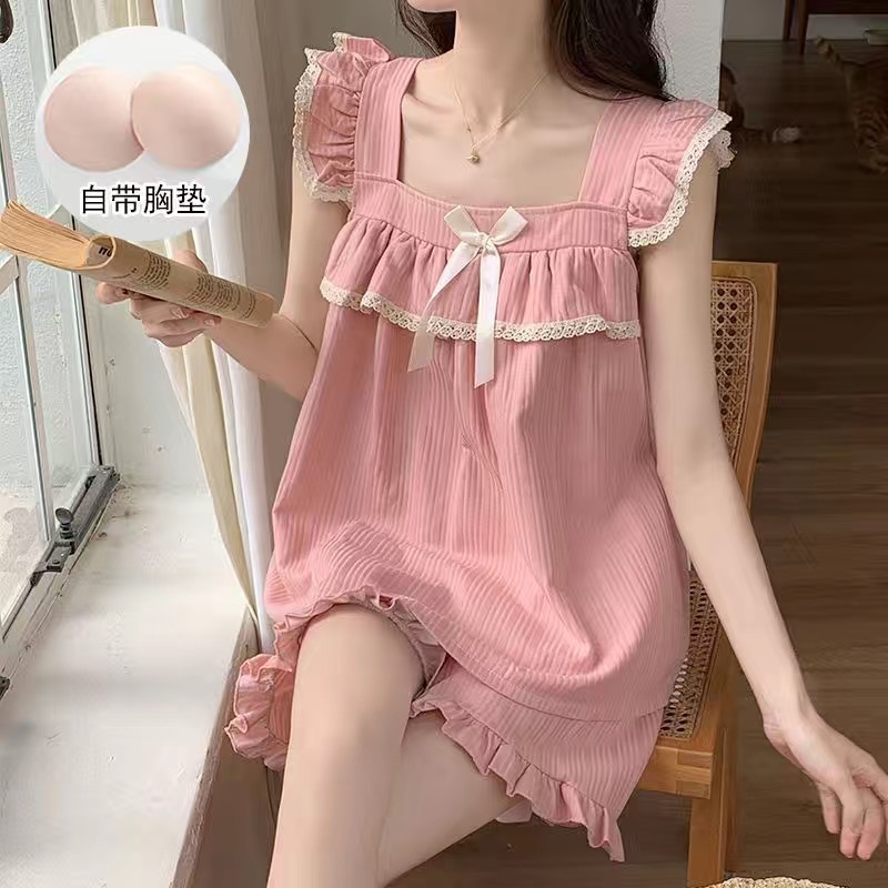 Ins夏の新型小飛袖半ズボンレースの辺の純色は胸のクッションのパジャマの女性のかわいい学生の家のスーツを持ちます。