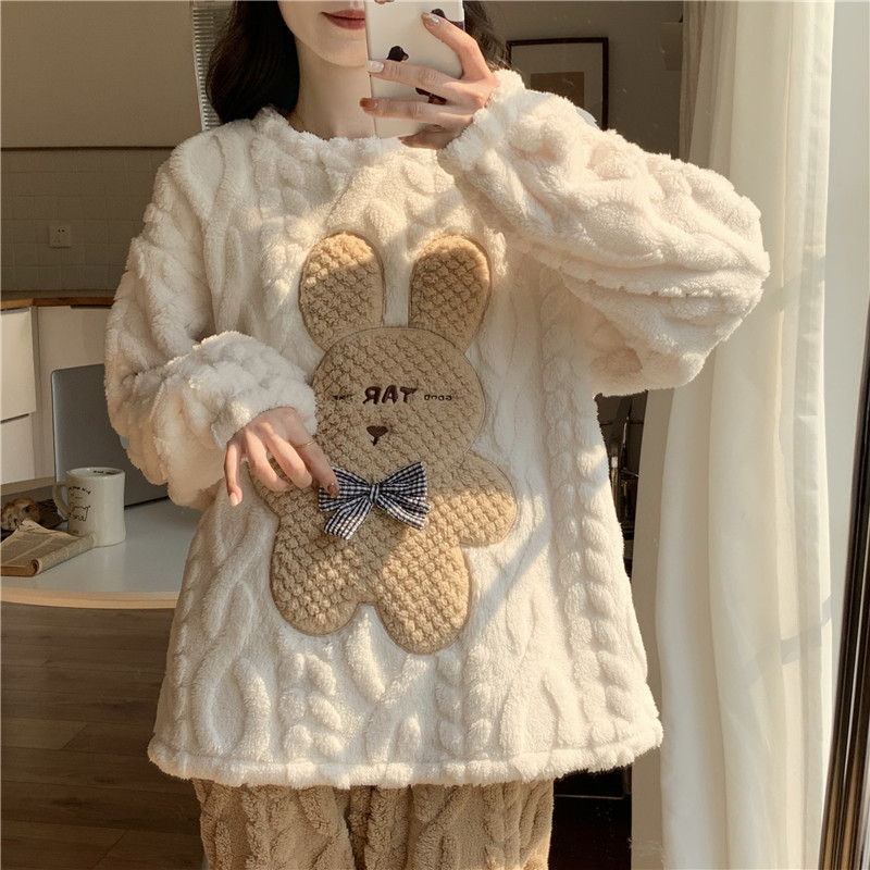 Ins生放送同品ジャカード漫画刺繍熊パジャマ女性秋冬厚い保温少女ホームウェア