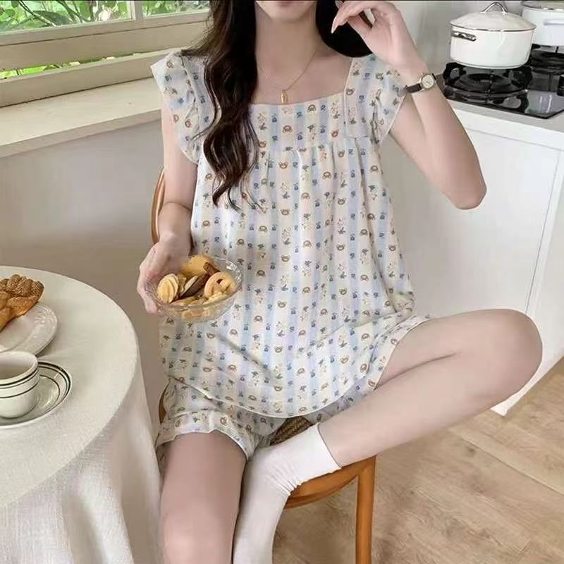 女性用の新しい夏のサスペンダーパジャマ、甘い木耳袖ショーツ、胸パッド付き、クラウドコットン無地ホームウェアセット