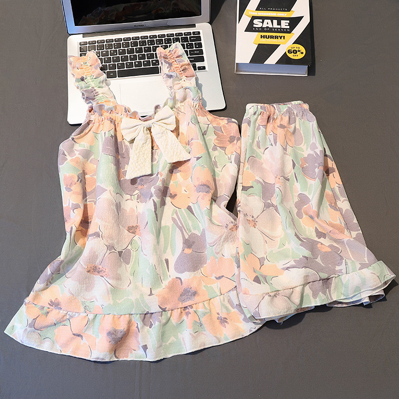 Ins日系夏レトロ小花ストラップ半ズボン泡綿パジャマ女性胸パッドカジュアル少女ホーム服
