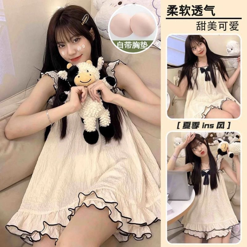 夏には胸パッド付きの蝶結びのストラップがあります。胸パッド付きのパジャマ女性は甘くて可愛いです。