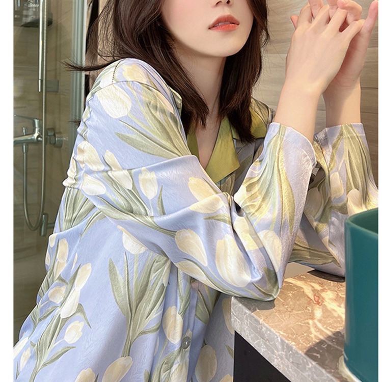 春のシルク風パジャマ レディース 長袖 軽やか 高級感 カラーブロック襟 チューリップカーディガン ネットセレブ ライブ配信 ホームウェア