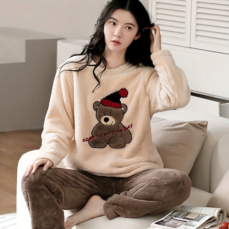 フランネルパジャマ女性秋冬アニメ熊保温ベルベット少女学生家庭ゆるいカジュアル丸首セット