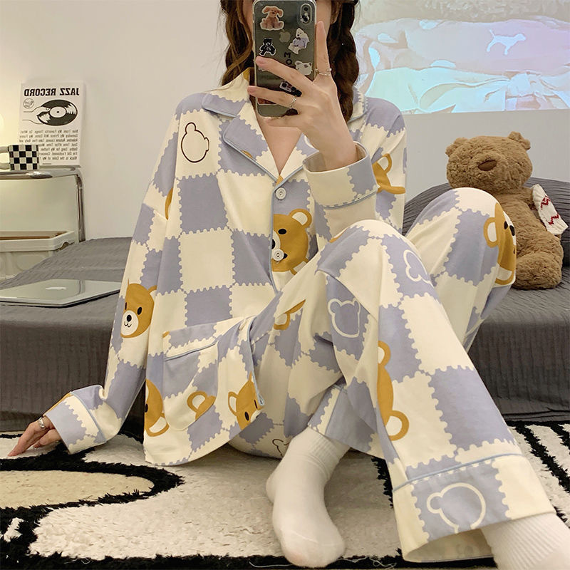 東南アジア外国貿易クロスボーダー長袖パジャマ女性春と秋のかわいい方眼漫画少女ホームウェア大きいサイズのスーツ