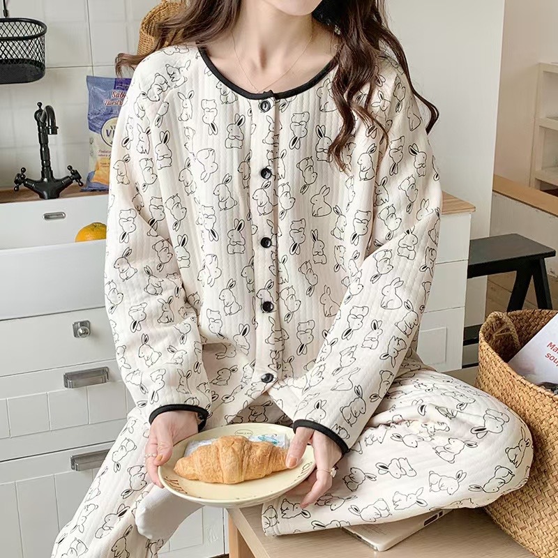 パジャマ女性秋冬保温漫画ウサギ丸首空気綿かわいい少女レジャー家冬ホームウェア