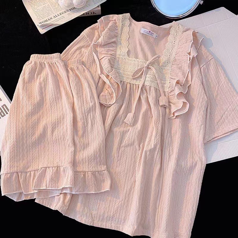 お姫様風パジャマ女性夏甘美綿ジャカード半袖パンツ純色ゆるい少女の家でカジュアルに着ることができる