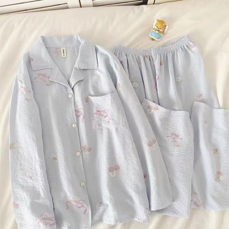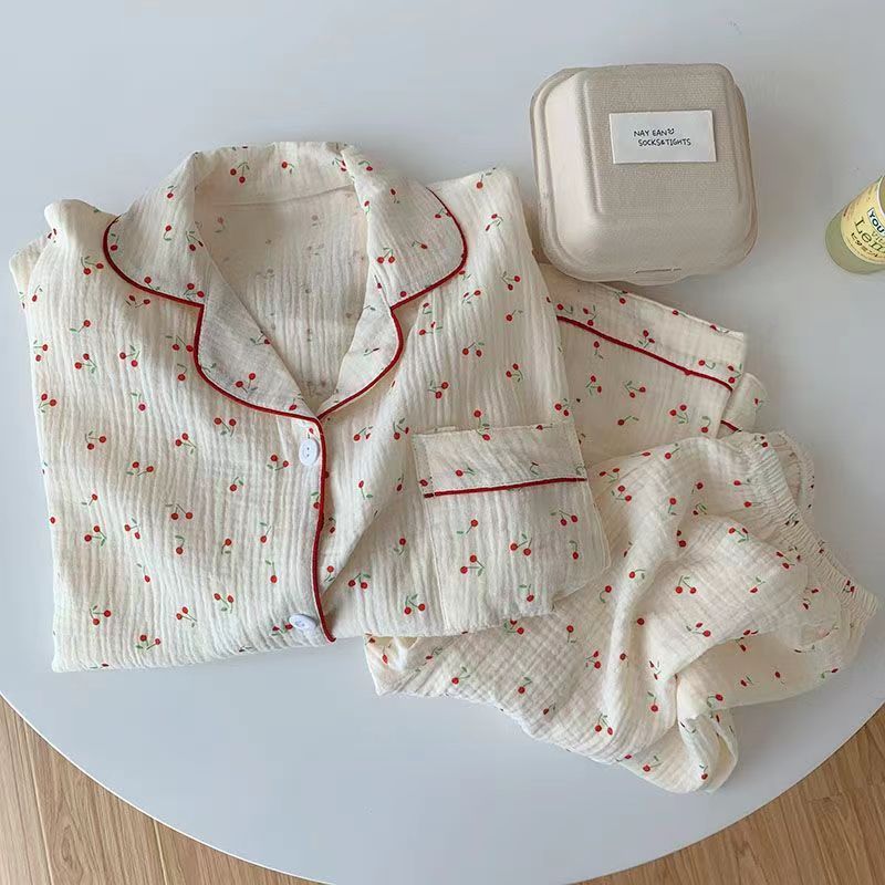 Ins田園風しわ布さくらんぼかわいい長袖パジャマ女性春の新しい襟付きカーディガン少女の家セット