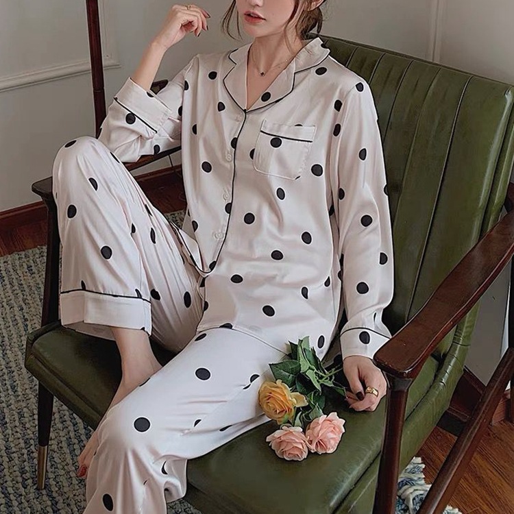 かわいい小さな波点長袖パジャマ女春秋シミュレーション糸少女ゆるいネット赤生中継対外貿易シルクセット