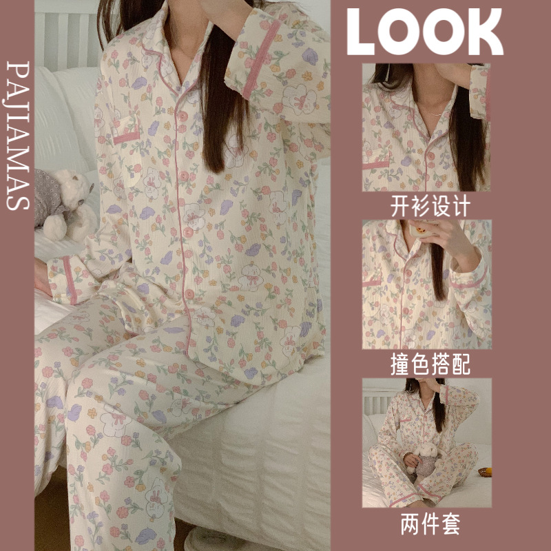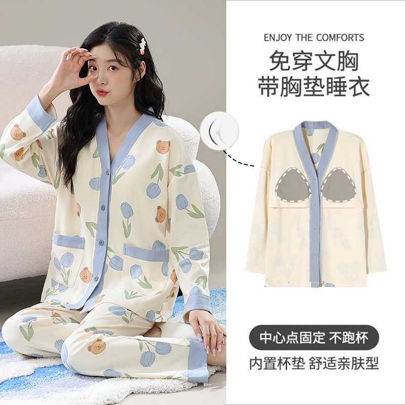 小香風パジャマ女性vネック胸パッド付きかわいいチューリップ長袖長ズボン学生家庭少女ゆるいセット