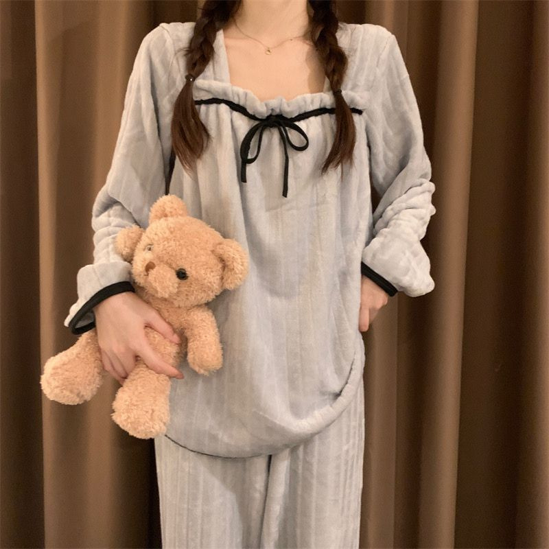 甘いお姫様風フランネルパジャマ女性秋冬保温ベルベット一字襟純欲少女ゆるい家服
