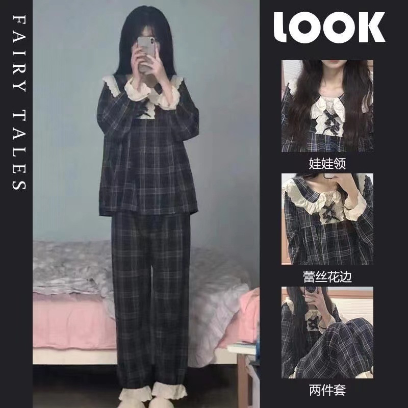 プリンセス風の甘いレースのパジャマ女性の子供の襟のレトロな格の学生の家の韓国の越境する部屋の服