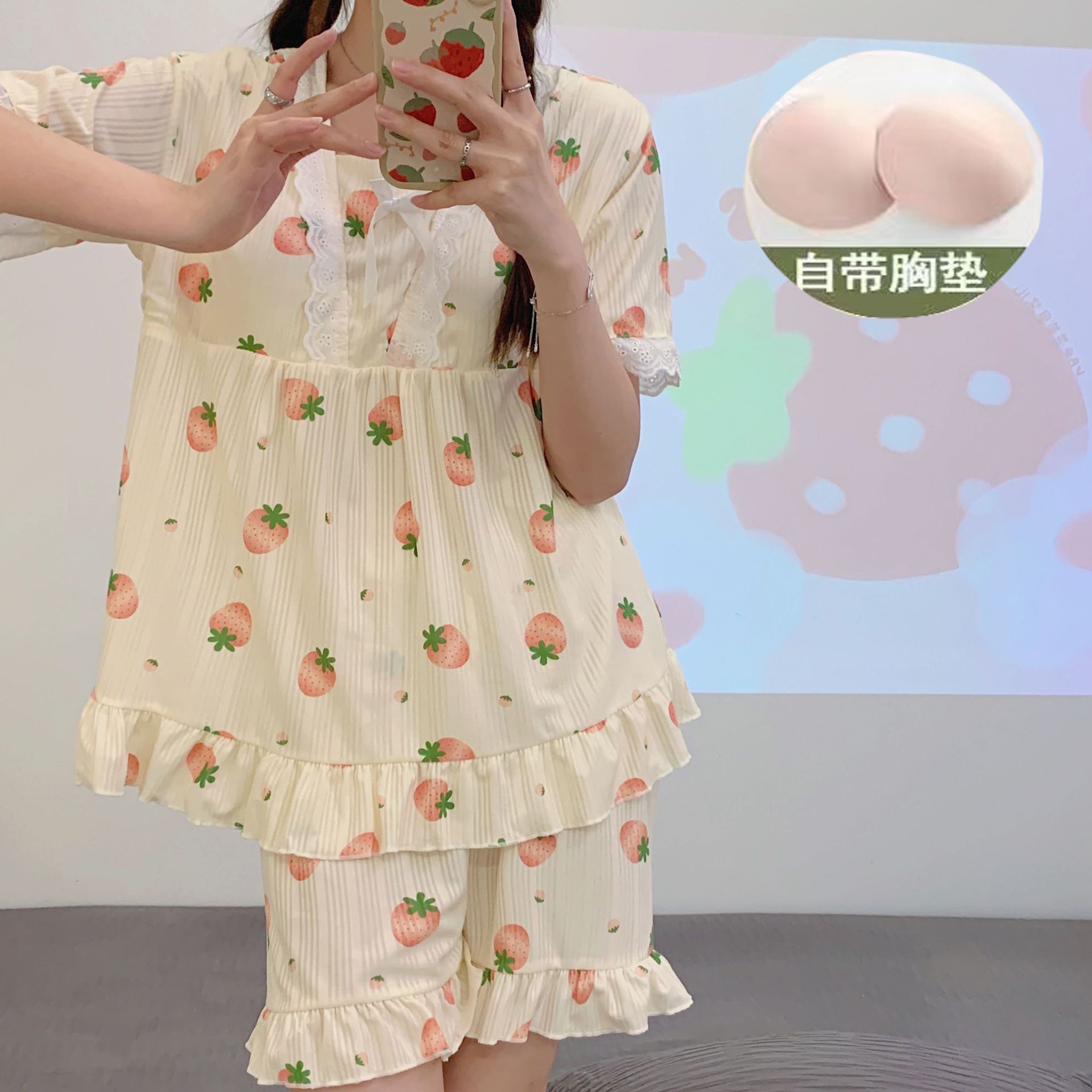 プリンセス風甘いvネック半袖パジャマ女性レース少女かわいいイチゴカジュアルゆるい外国貿易スーツ