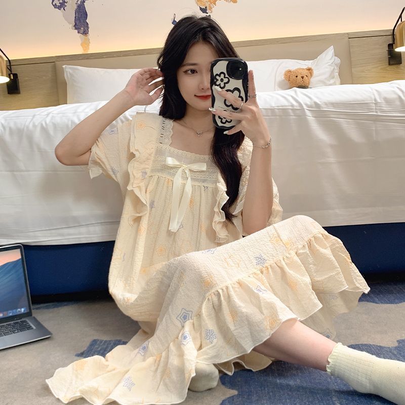 お姫様風レース半袖パジャマ女性夏の布帛泡綿甘い少女かわいいゆったりホームウェア
