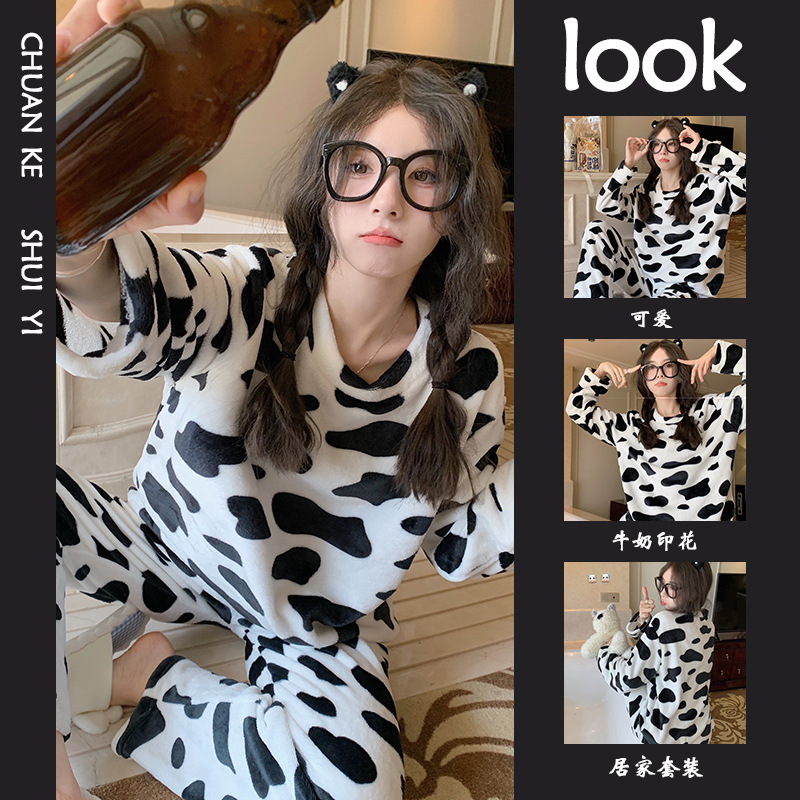 Insかわいいベルベットパジャマ女性白黒乳牛甘い学生少女家庭カジュアル丸首保温セット