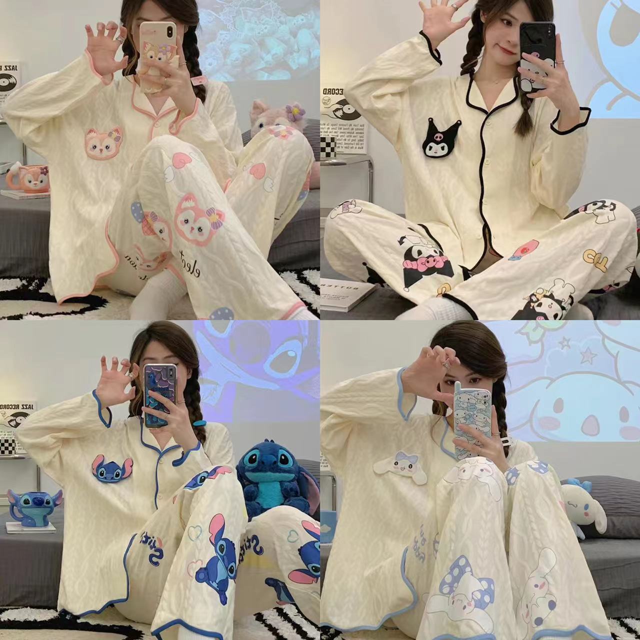 クロミのパジャマの女性の黒い底の甘いアニメの長袖のズボンは学生のカーディガンの外国貿易の部屋の服をめくって外に着ることができます。