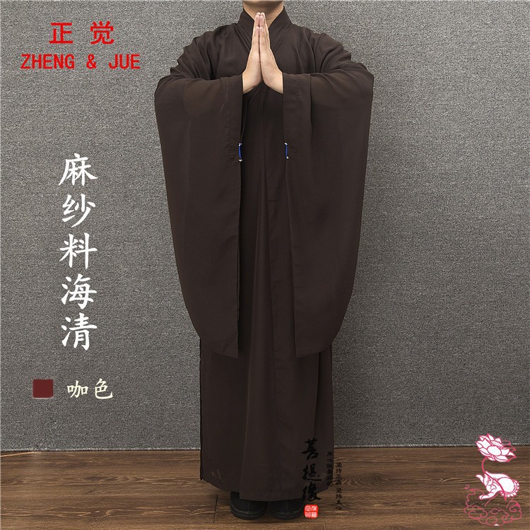 男女兼用シャンシンユアンロングコート、コーヒー色の法会麻素材、海清居士服、海清