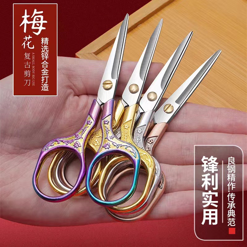 レトロな梅の花はステンレスの家庭用はさみの糸を切ります。