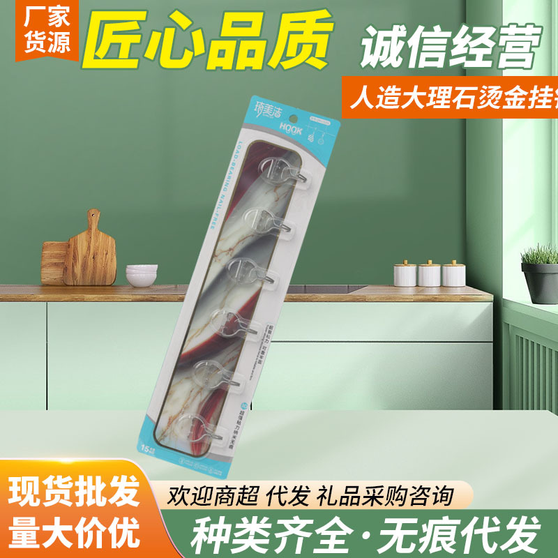痕跡のないフック、釘不要の粘着フック、6連人造大理石ホットスタンピングフック、壁キッチン家庭用フックホルダー