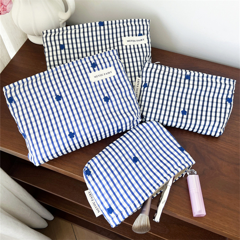 チェック柄ブルー刺繍フラワー化粧品袋女性の口紅収納袋エアクッション化粧品袋収納袋大容量