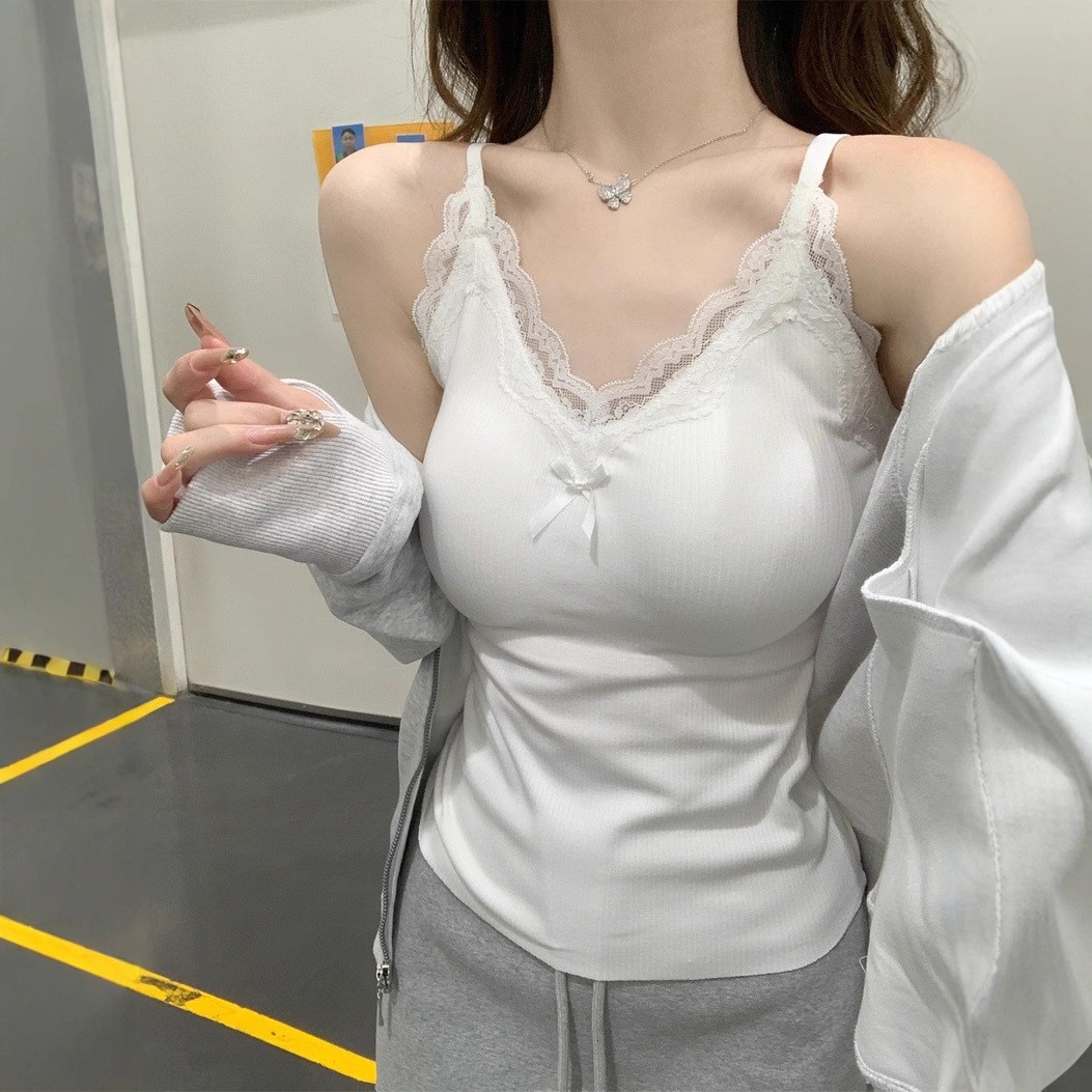 新しいレースキャミソールレディースリボンキャミソールインナー胸パッド付きVネックスリムショートホットガールトップ