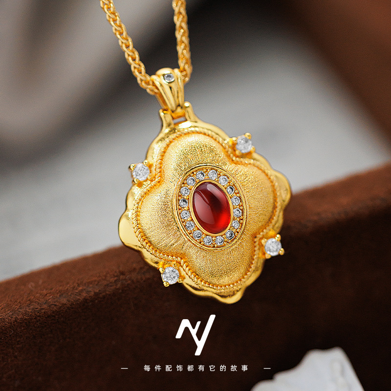 軽くて豪華なデザインのフィリグリー金メッキベゴニア古代サンドゴールドネックレス、ダイヤモンドとルビーがちりばめられたブリスティングゴールドペンダント
