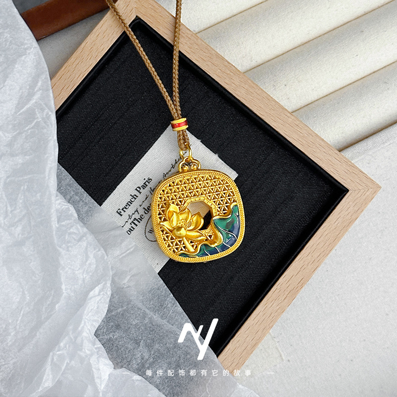 新型古法金エナメル彩蓮塘月色ペンダント砂金国風透かし編み花糸ハス編みロープネックレス