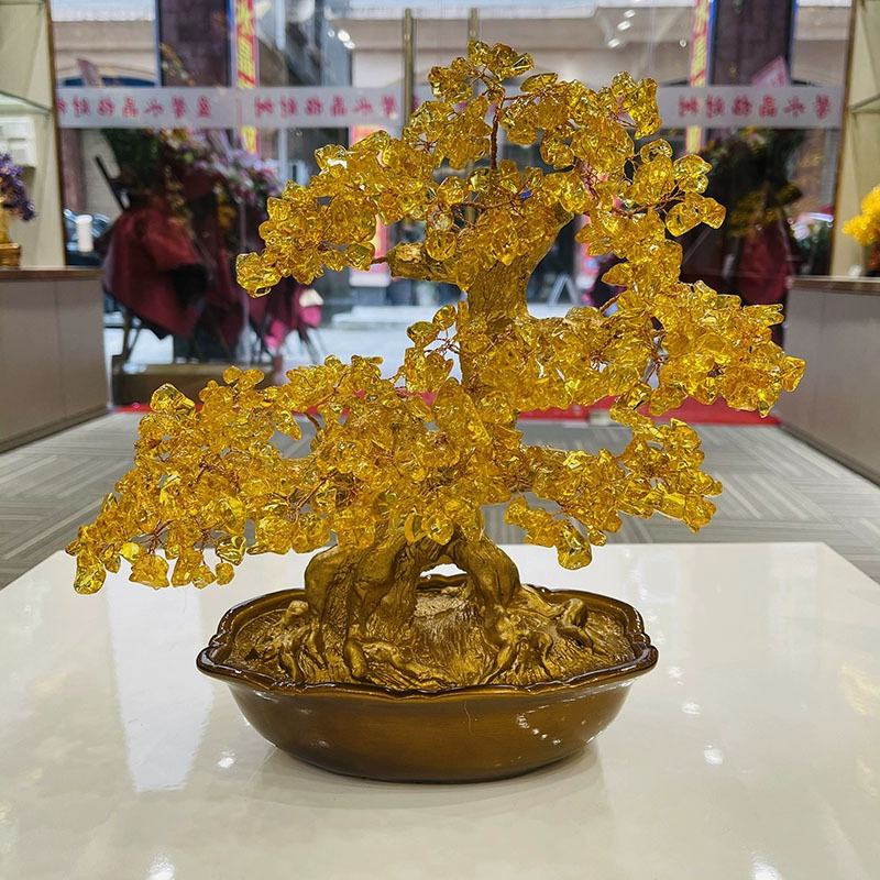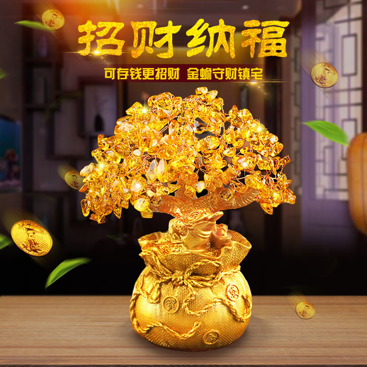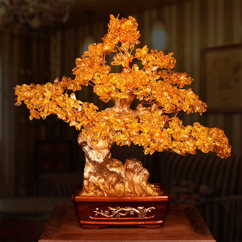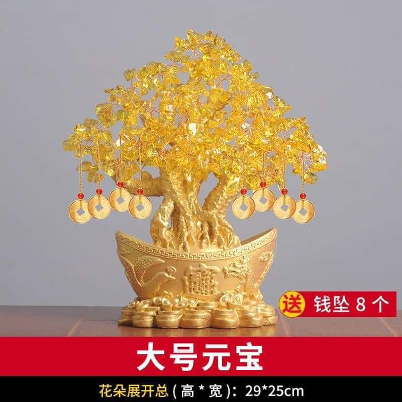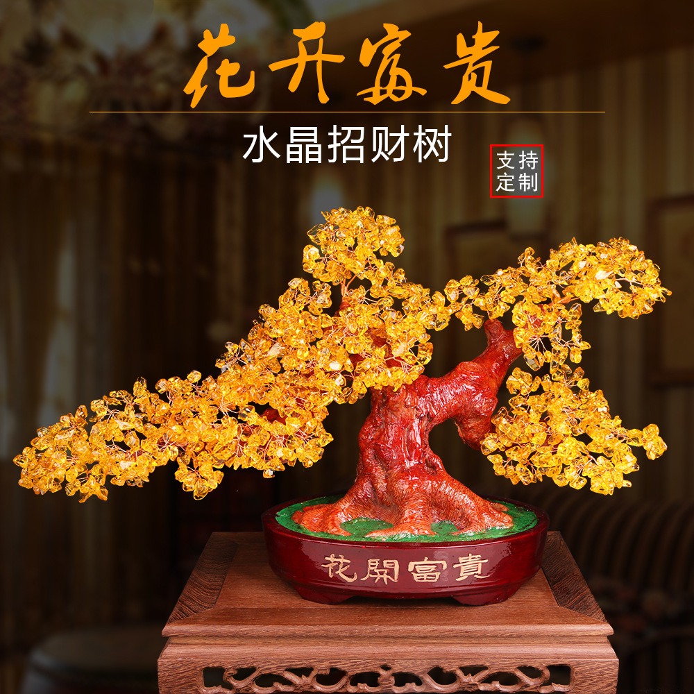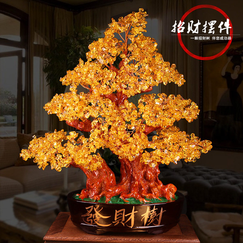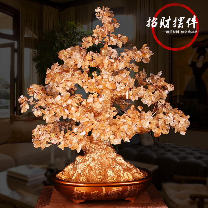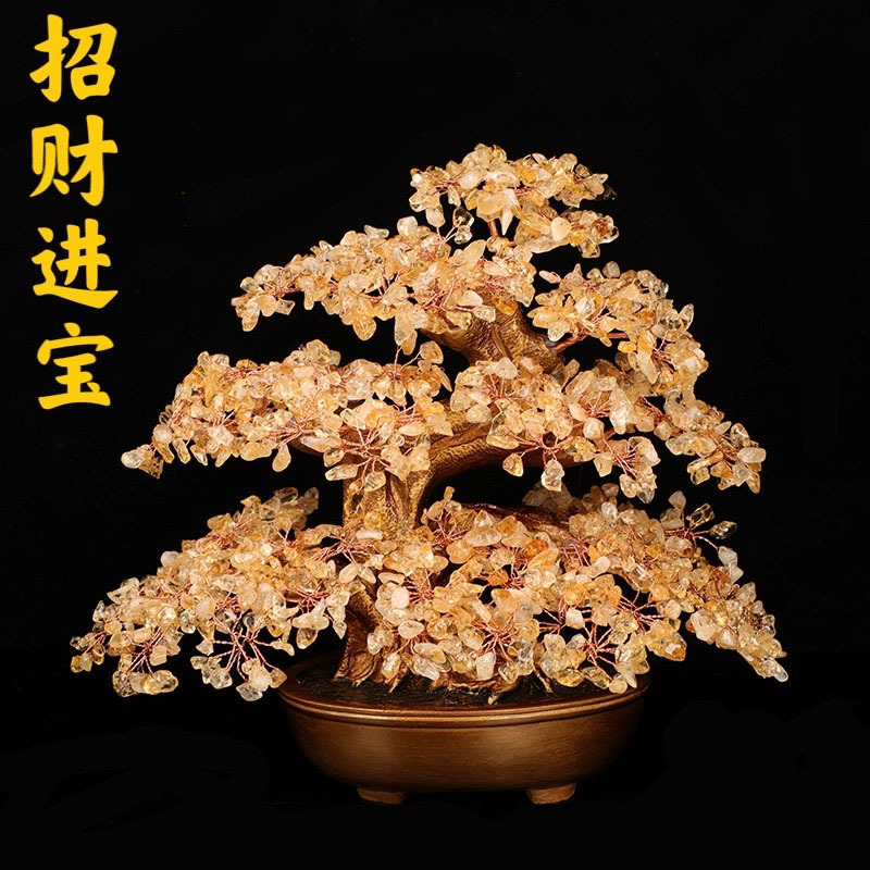 天然黄水晶招財樹発財樹招財金色盆置物酒箱装飾品家庭客間金の木