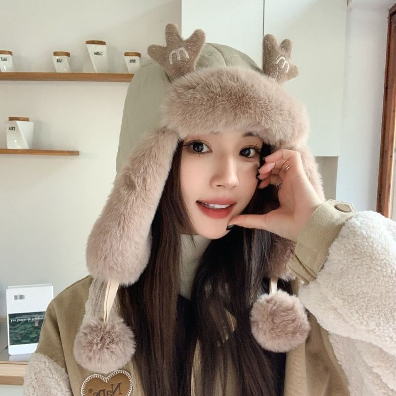 新しい鹿の角のぬいぐるみのかわいい帽子の女性の冬の厚いベルベットの保温自転車の防寒毛球の耳の帽子