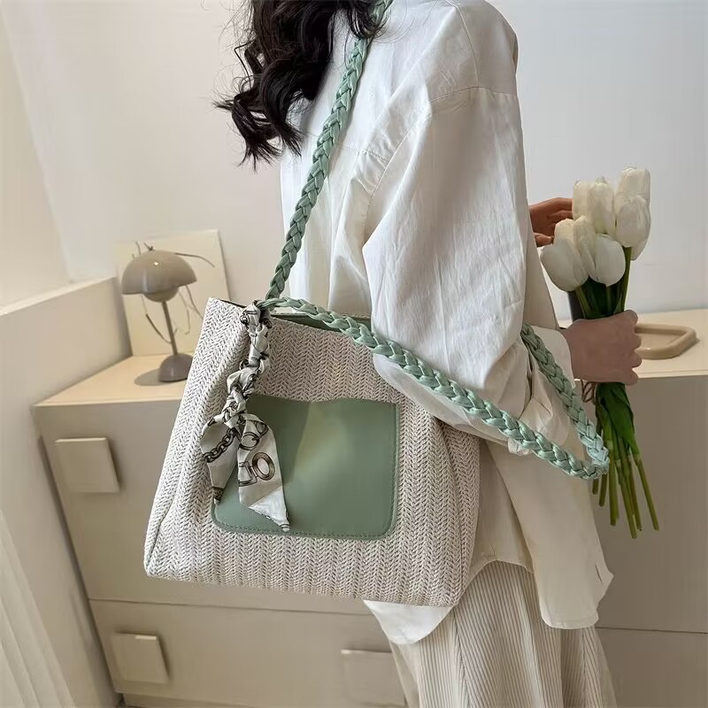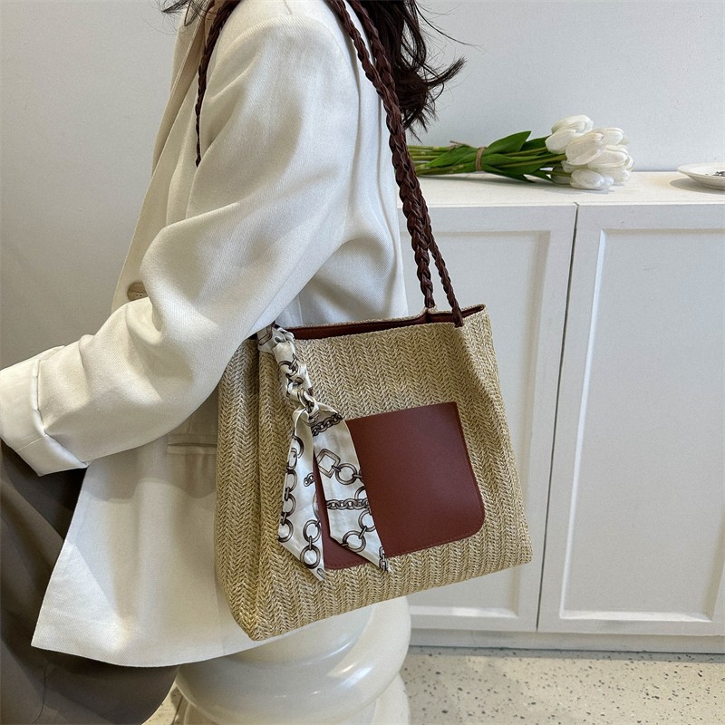 大容量バッグ女性2023新型春潮流編みシングル肩女性バッグファッション草編みカジュアル通勤トートバッグ