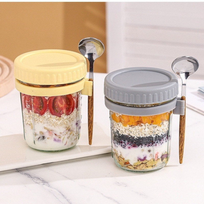 オーバーナイトオートミールカップ 密閉朝食 スプーン付き 蓋付き ミルクガラス ポータブルミルクシェイク