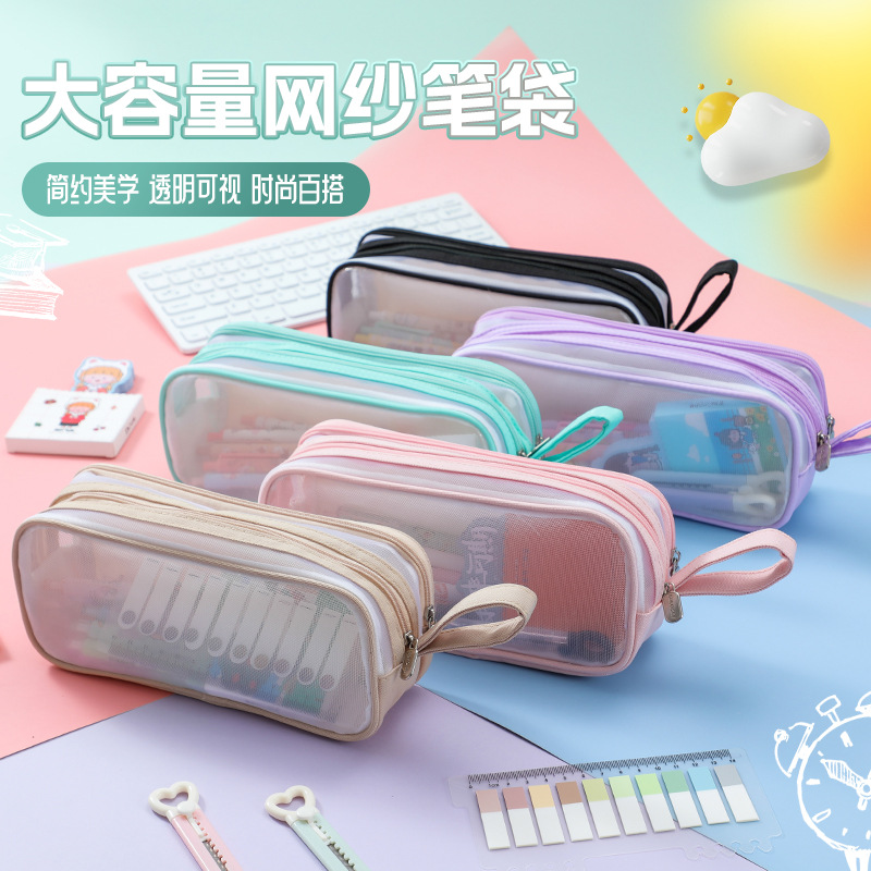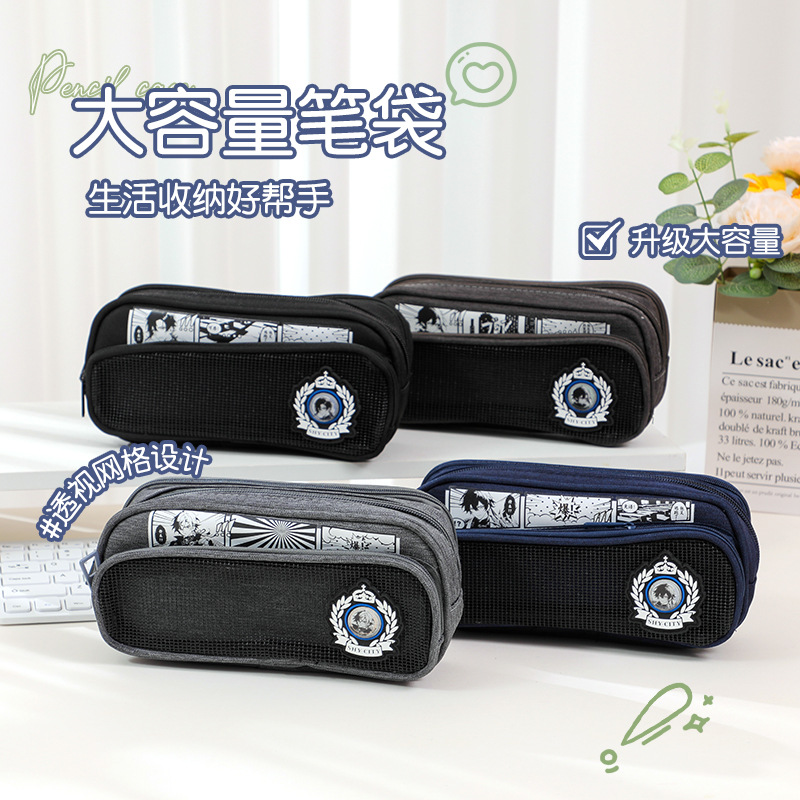 オリジナルアニメ風網糸大容量ペン袋汚れに強いシンプルな男子学生多機能鉛筆収納袋