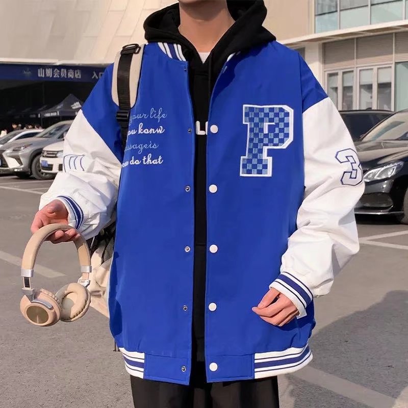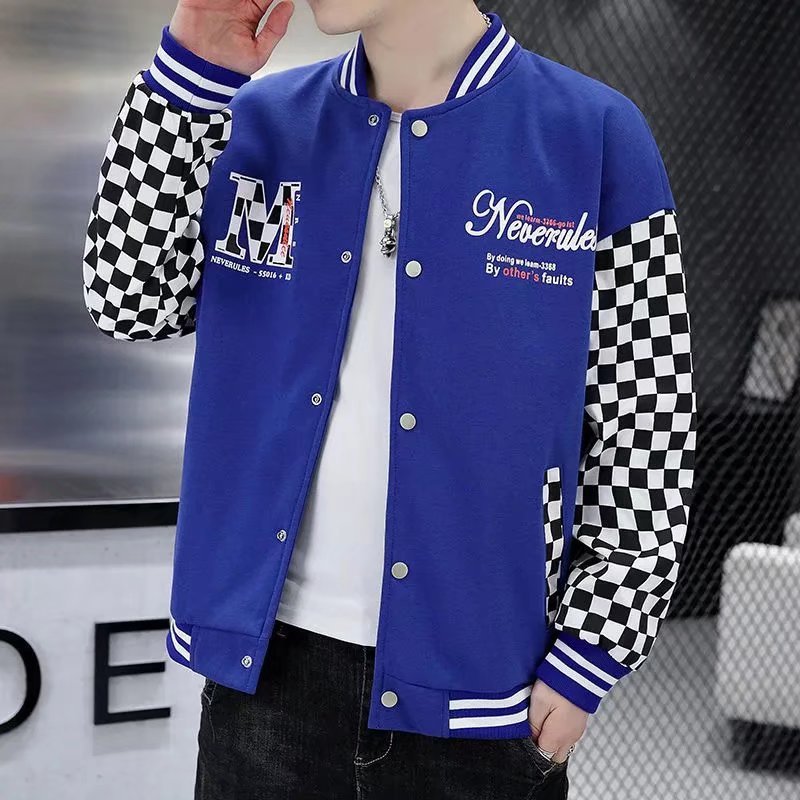 春のメンズジャケット クラインブルー ベースボールジャケット カジュアル ゆったりトップス プリント入り 学生 カップル ジャケット メンズ トレンド