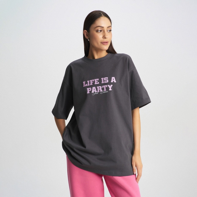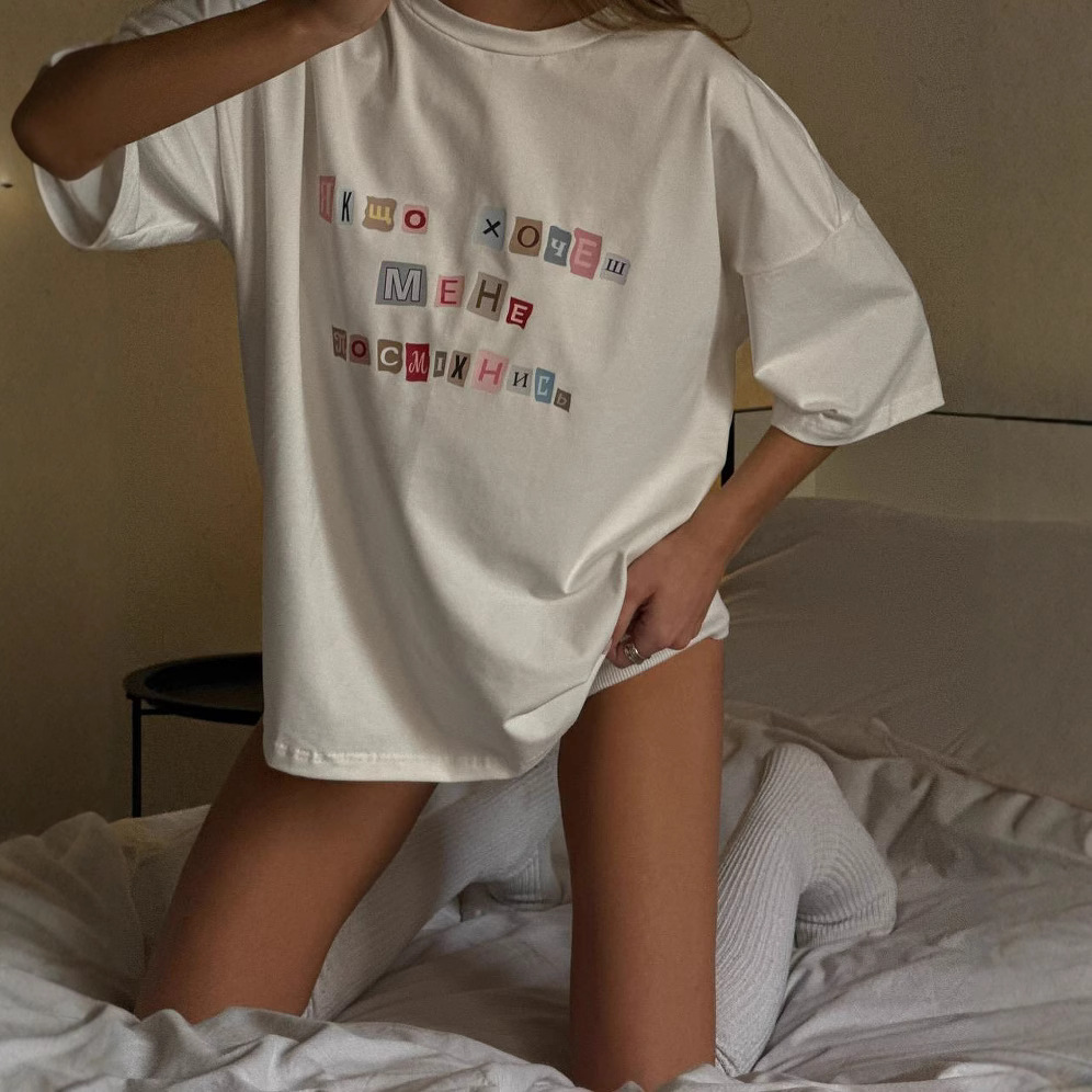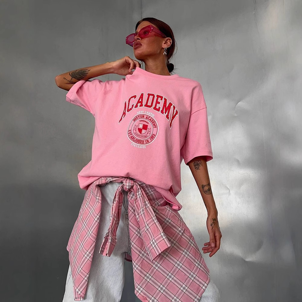 速売通クロスボーダー文字プリントカジュアル上着欧米の新型ゆるい丸首落肩袖半袖tシャツ女装