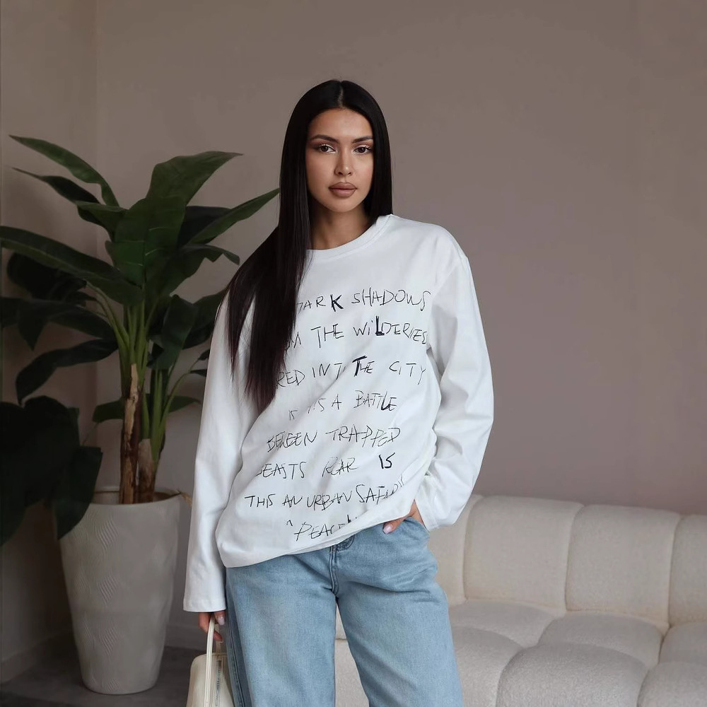 独立駅の起爆文字プリント上着の女性2025春の新しいゆるい丸首落肩袖長袖tシャツの女性
