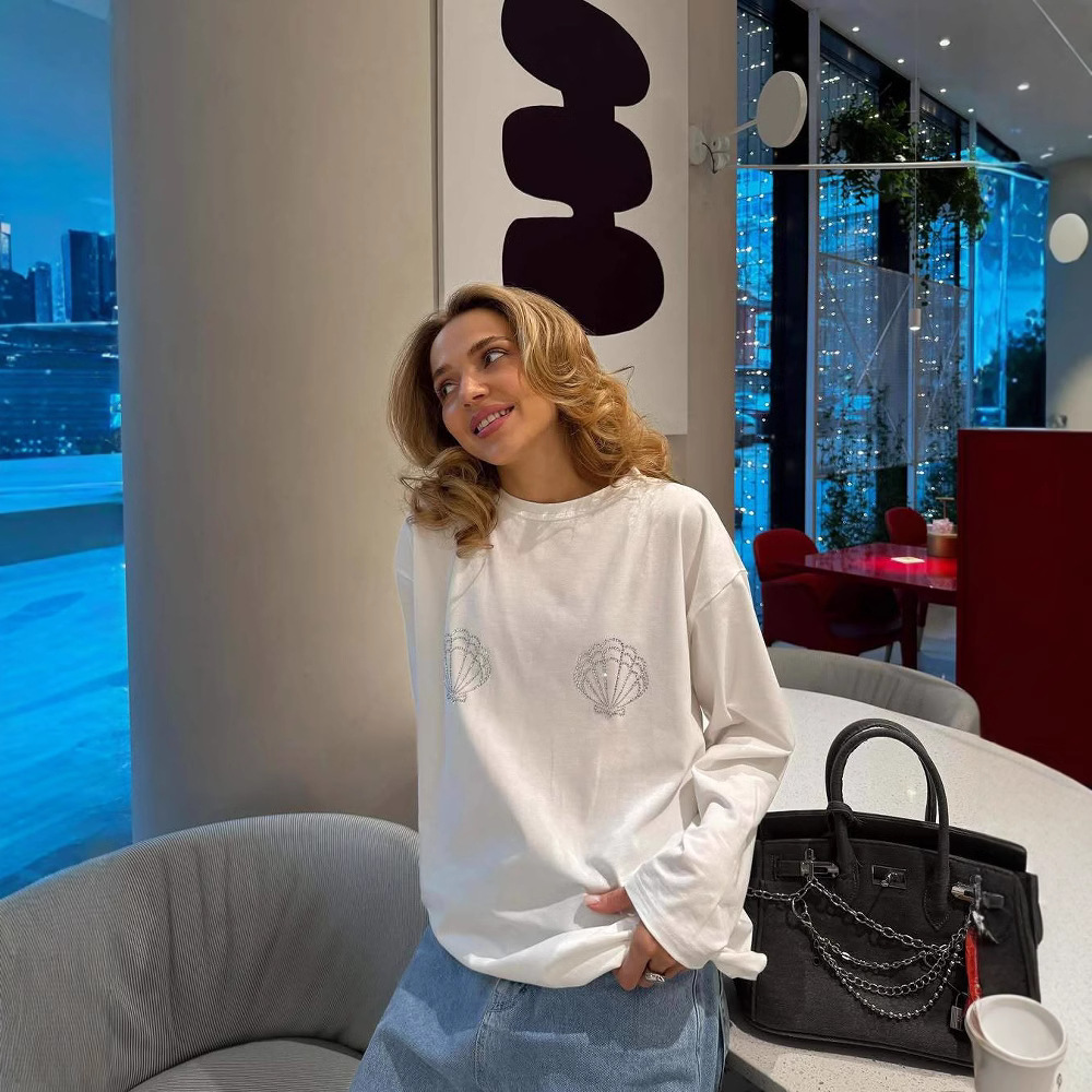 白い潮牌の薄い金のゆったりした長袖のtシャツの女性の春秋2025新型のアメリカの中で丸首の底のシャツの上着を掛けます。