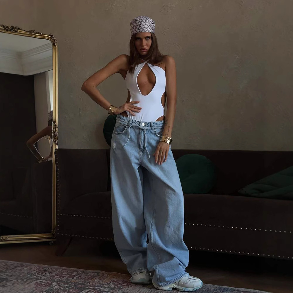 アメリカのレトロな街頭の潮流の新型のゆったりした腰の高い穴の小さい大衆の設計はひもの広い足のジーパンの婦人服を結びます。