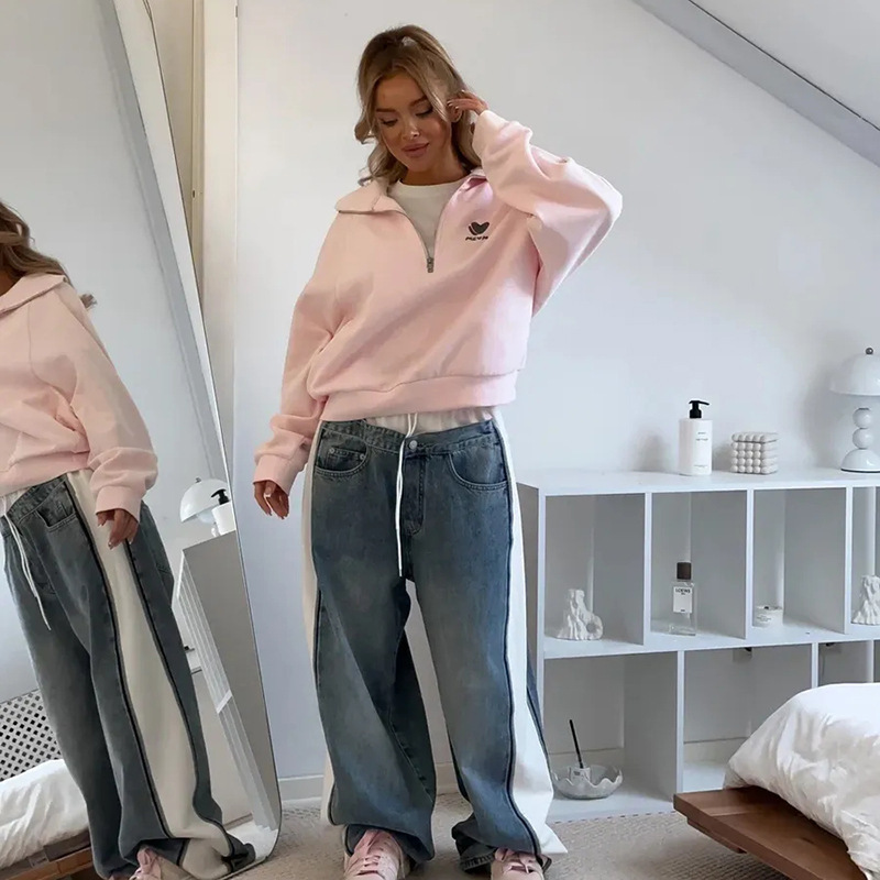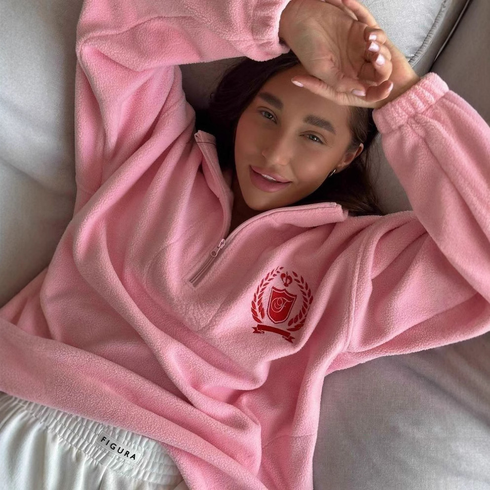 速売通の起爆バッジのプリントがゆったりしていて、怠惰な風が肩の袖の長袖の半ファスナーのフリースの女性服に落ちます。