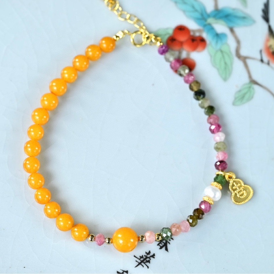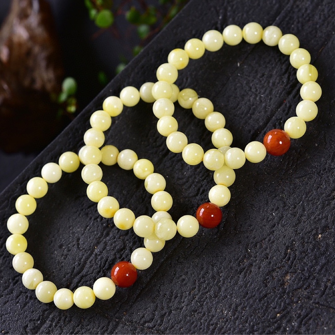 天然鶏油黄蜜ろう手串と南紅瑪瑙節高銀飾りサイズ約7ミリ重約9グラム