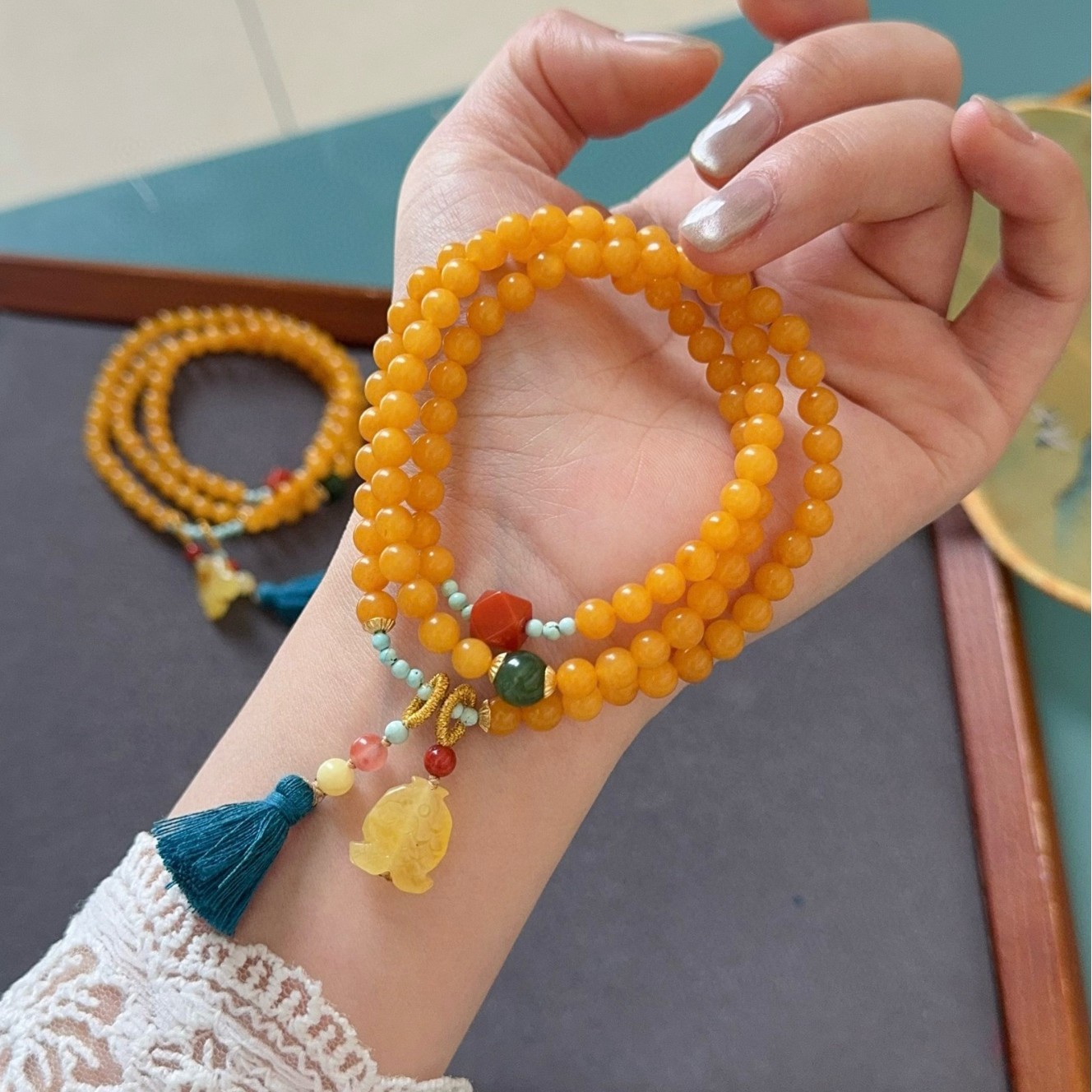 天然老蜜ろう三輪手串満蜜鶏油黄老ろう配原鉱緑松石南紅サイズ5.4ミリ