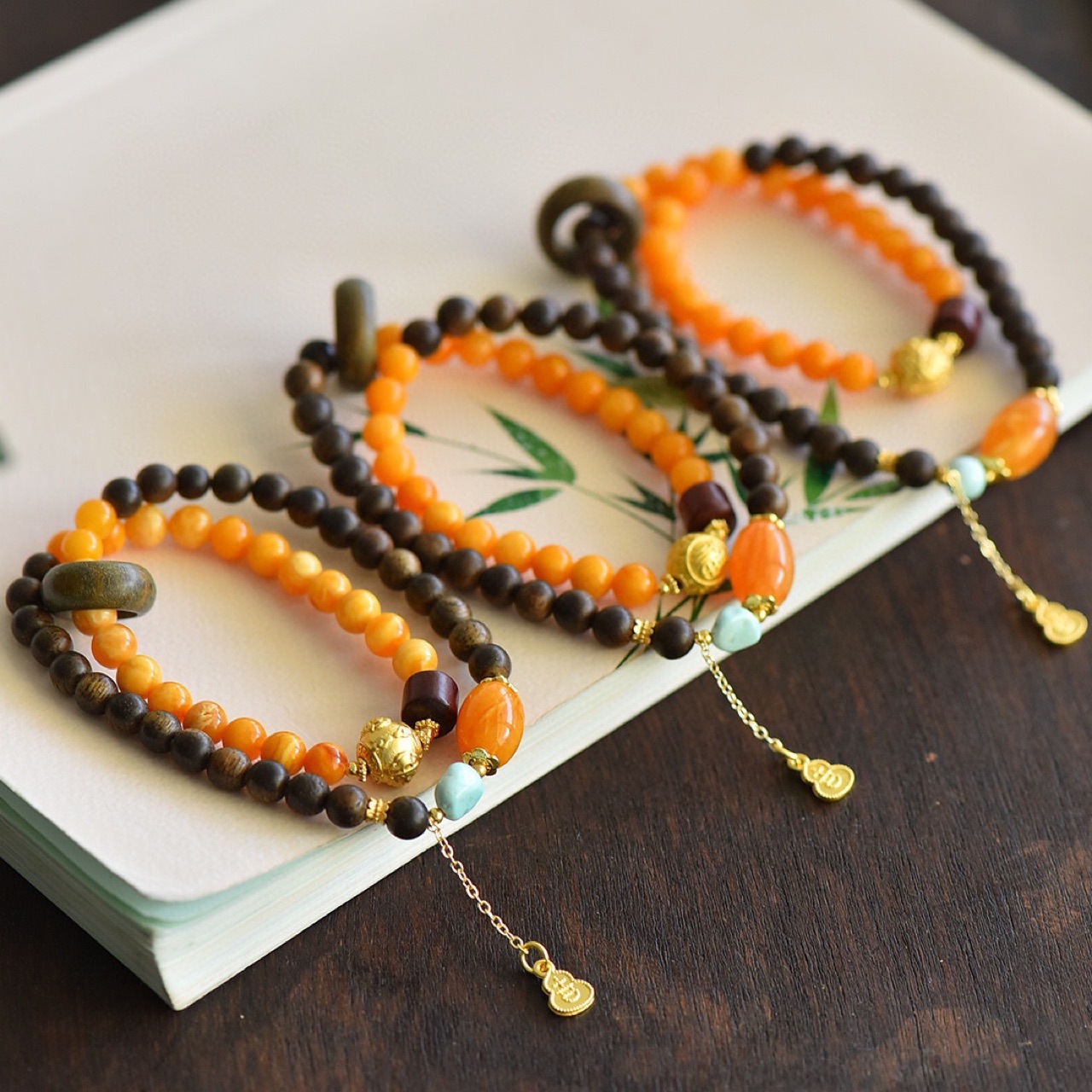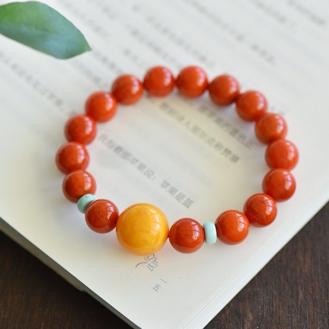 天然南赤瑪瑙ブレスレット、柿赤、大小均一、老花ワックス蜜蝋ビーズ付き