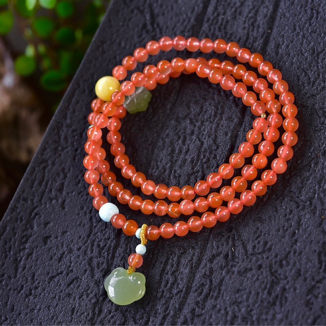 天然南紅瑪瑙三輪ブレスレット桜紅水紅と蜜ろうと田玉南紅の手串