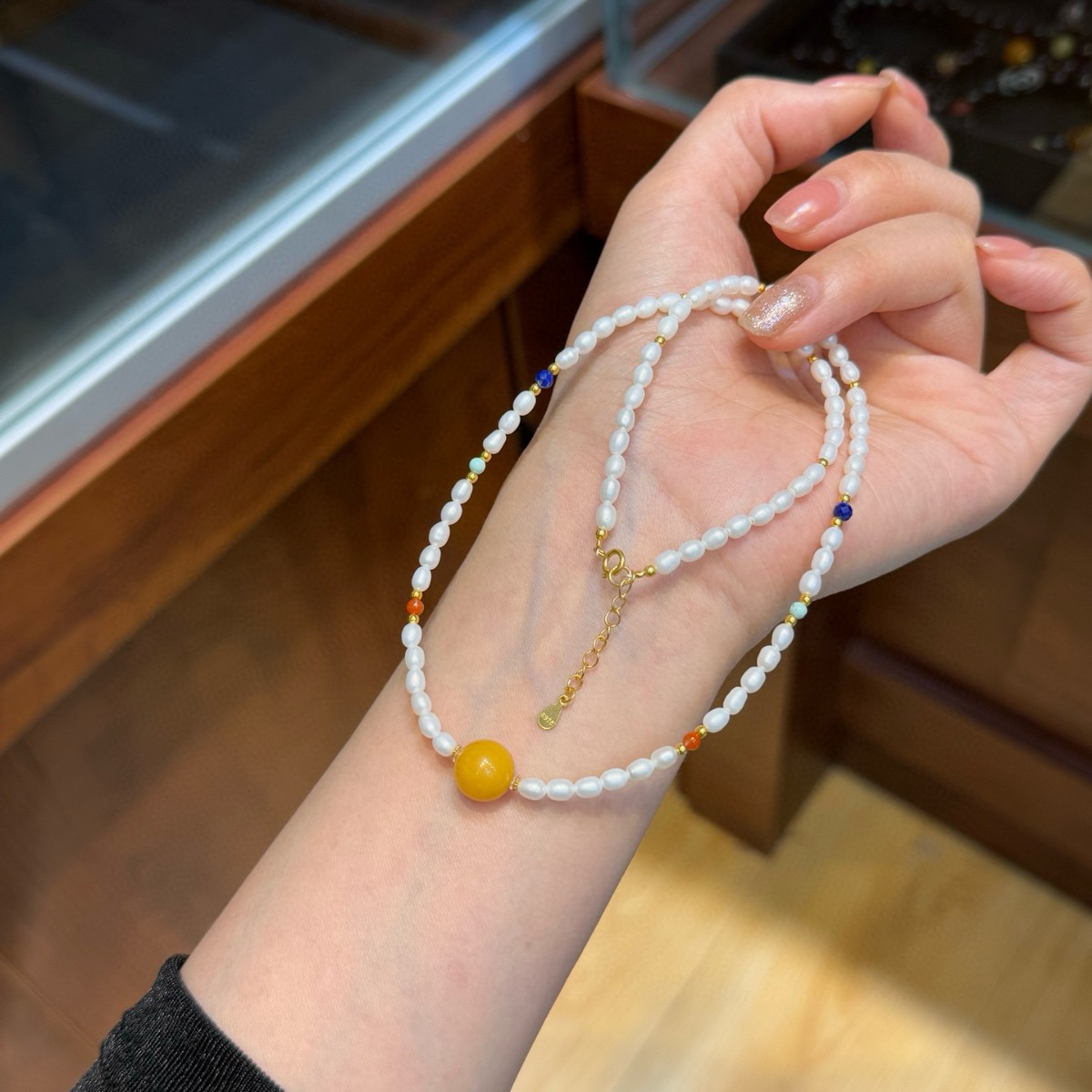 夏のハイエンドで多用途な古い蜜蝋とパール鎖骨チェーン女性用ニッチビーズ気質鎖骨ネックレスジュエリー
