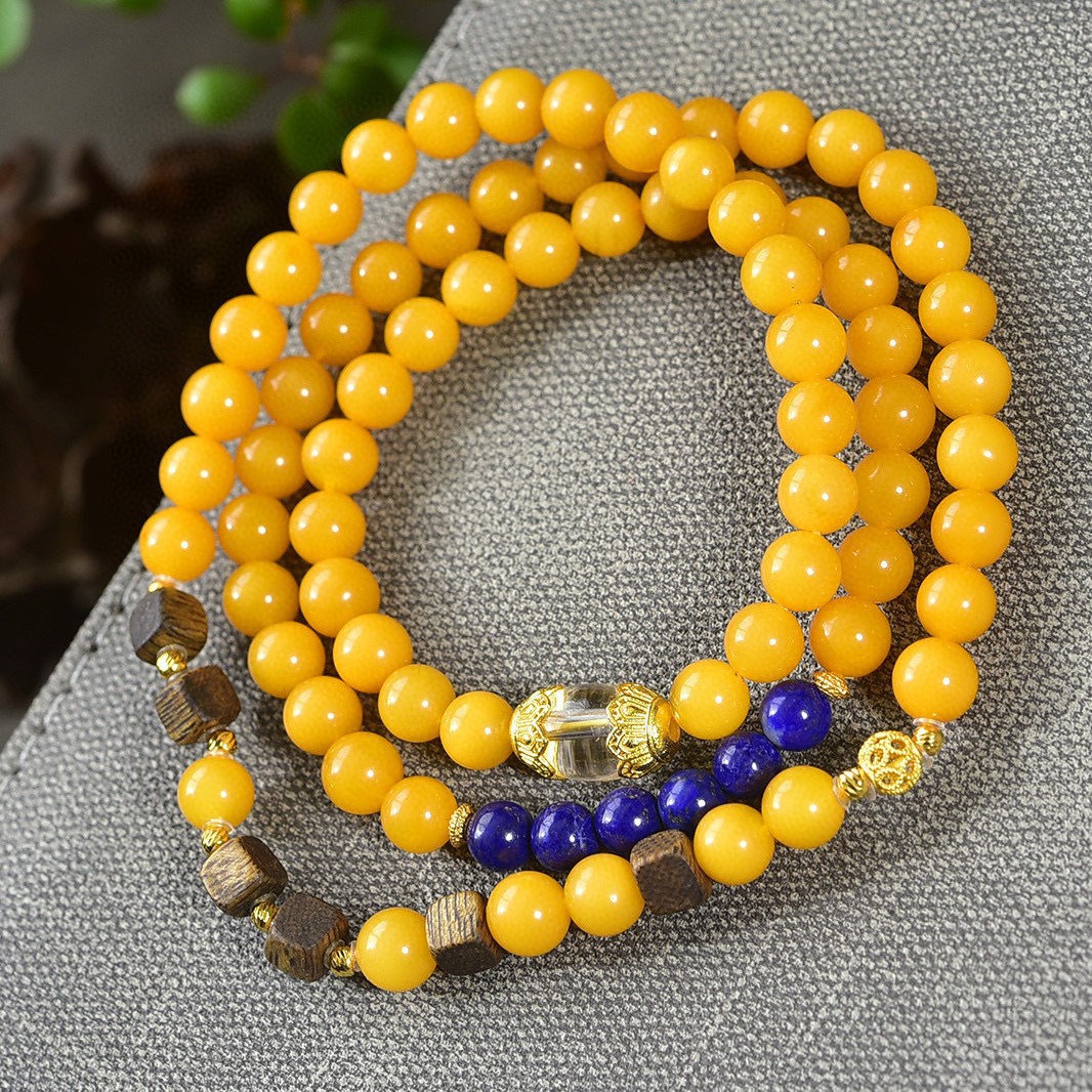 天然鶏油黄色古蜜蝋三連ブレスレット、蜜蝋小魚付き、サイズ約5.5mm、多連蜜蝋
