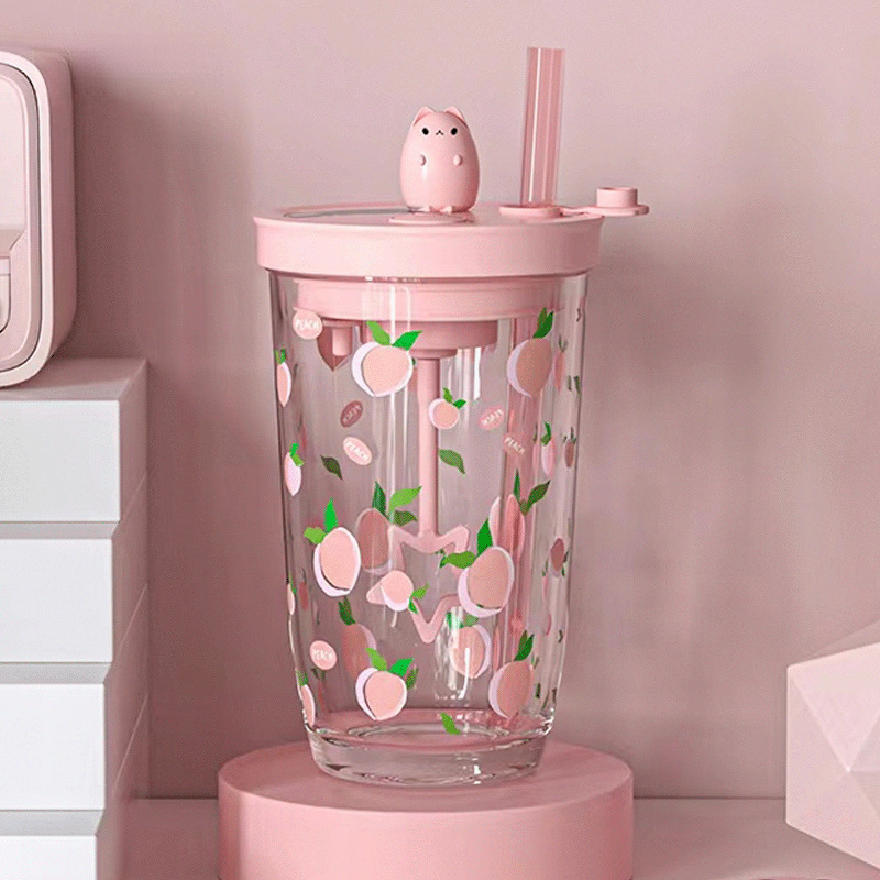 玻璃水杯熊猫浮雕带把果汁杯咖啡杯带盖带吸管轻奢ins大容量水杯