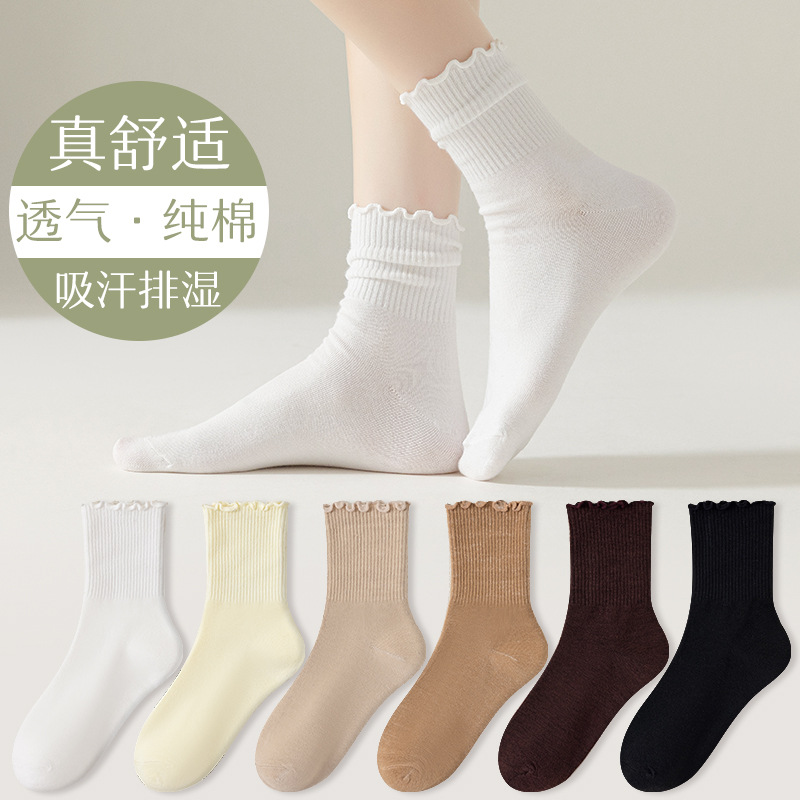 秋冬の木の耳元の靴下の女性の白い純色の中筒の靴下のファッションのレースの百合の綿の靴下の山の靴下の日系の風