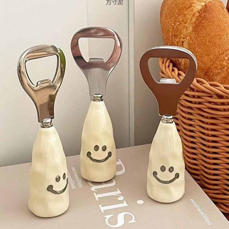 かわいい笑顔のビールの栓抜き器の陶磁器の柄は立っていてもいいです。