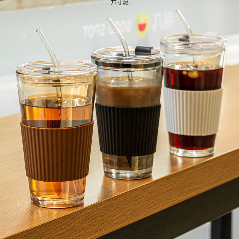 コーヒーカップ風シンプルなガラスストローカップオフィスカップ蓋付き学生携帯グラスカップ卸売り