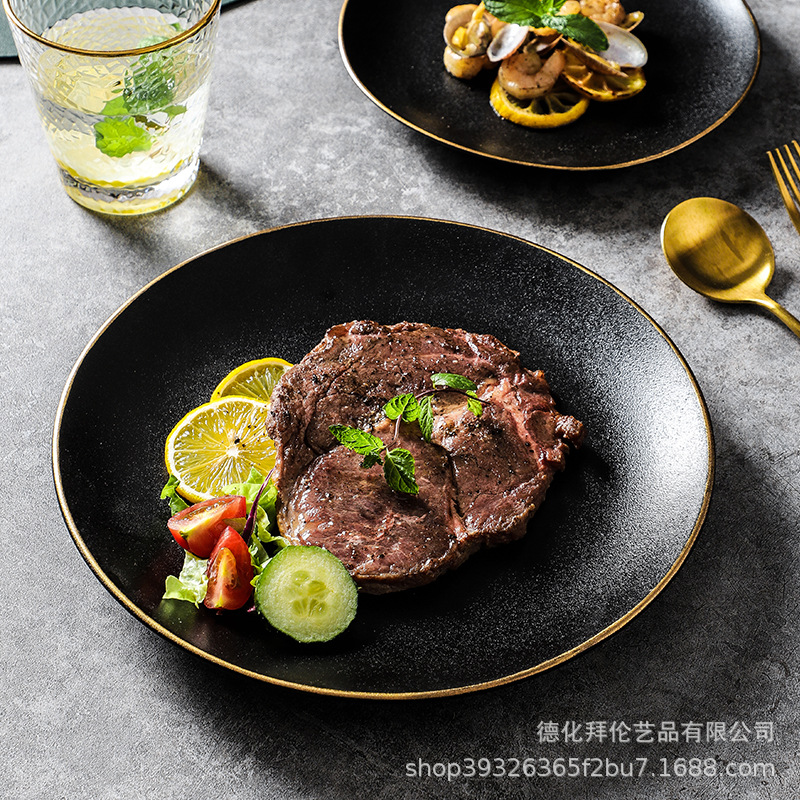 ステーキ皿洋食皿クリエイティブブラックフロスト金辺ステーキ皿商用セラミック食器洋食皿